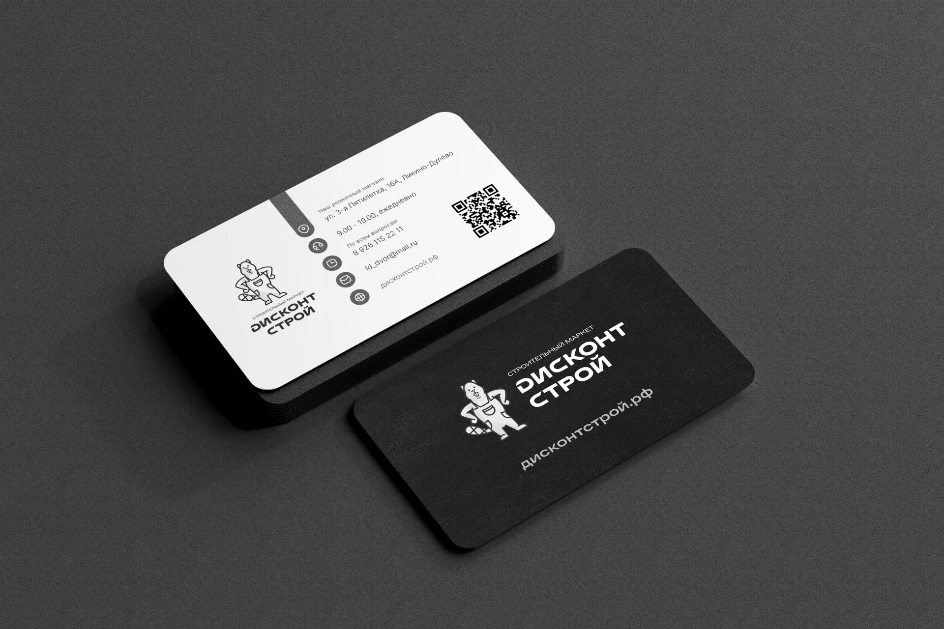 Вместе с логотипом, мы предложили заказчику сразу визуализацию логотипа в возможном дизайне на фирменный визитках магазина «Дисконт Строй» в Сортавале.