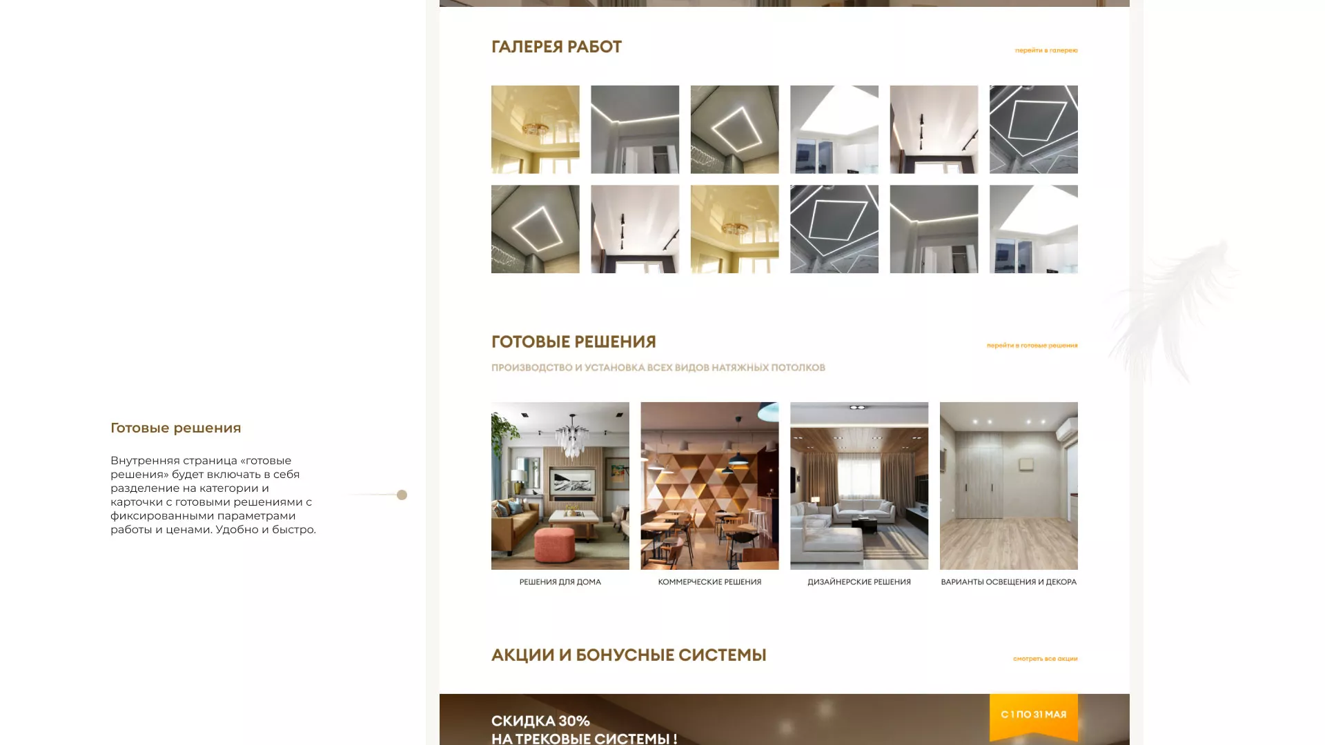 Что мы сделали. Разработали сайт в теплых и уютных «шоколадных» тонах. Продумали структуру, наполнили ее удобными разделами такими как «готовые решения», которые включают в себя не только уже готовые варианты с фиксированной ценой, но и разделение по категориям: решения для дома, коммерческих помещений, интересные дизайнерские решения. Так же предложили клиенту онлайн-калькулятор, что может существенно упростить потенциальным заказчикам нашего клиента в Сортавале заказ потолков.