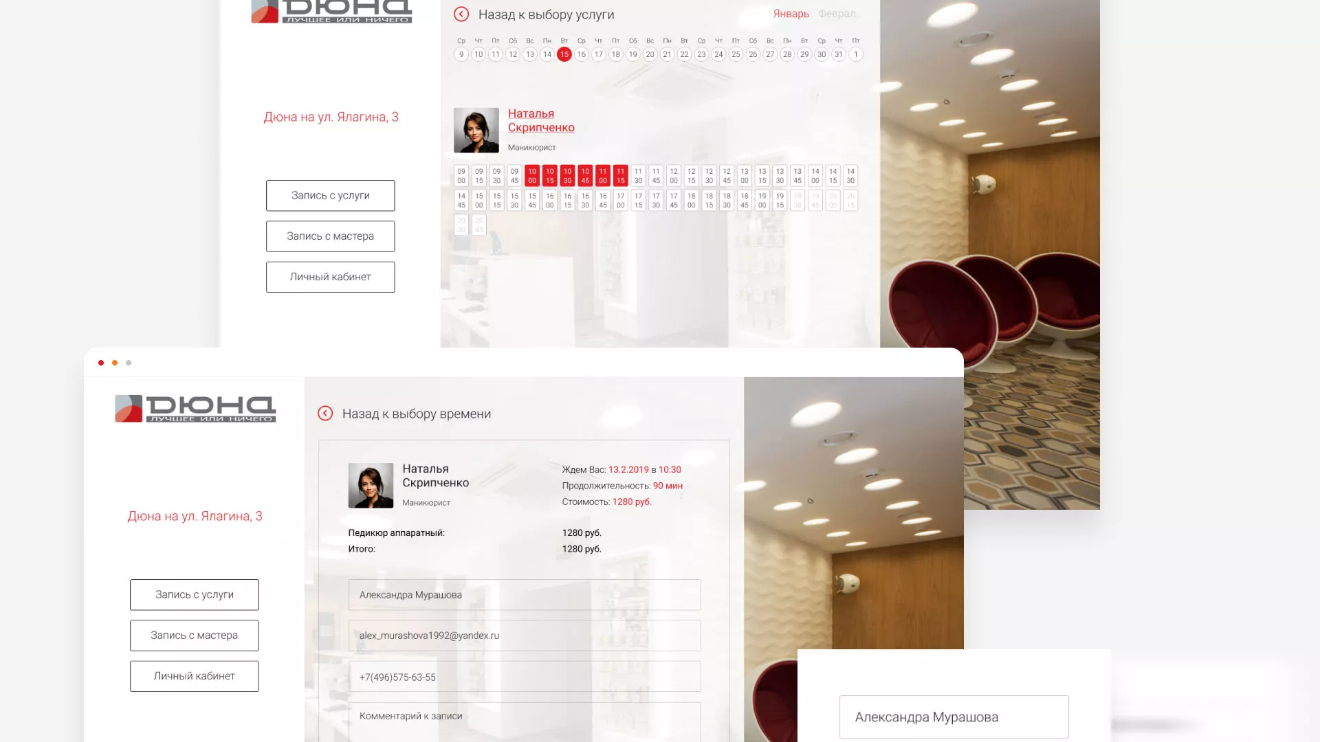 В разделе «Личный кабинет» содержатся все текущие записи в салоны красоты в Сортавале, с возможностью их отмены. Также, здесь можно редактировать свои персональные данные, ознакомиться с историей записей и видеть бонусы и акции салонов красоты.